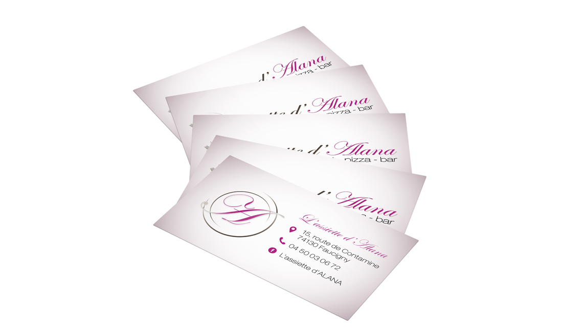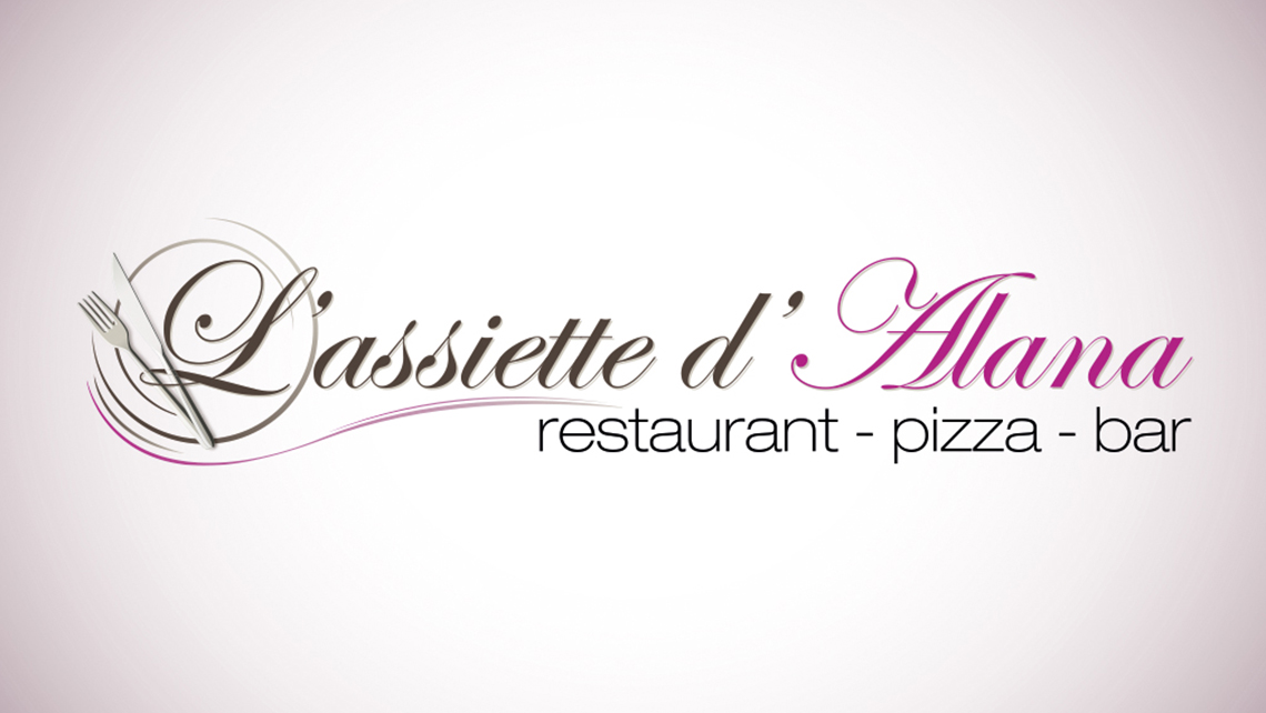 Création du logo du restaurant l'Assiette d'Alana à Faucigny. Déclinaison par la suite sur cartes de visite et flyers.