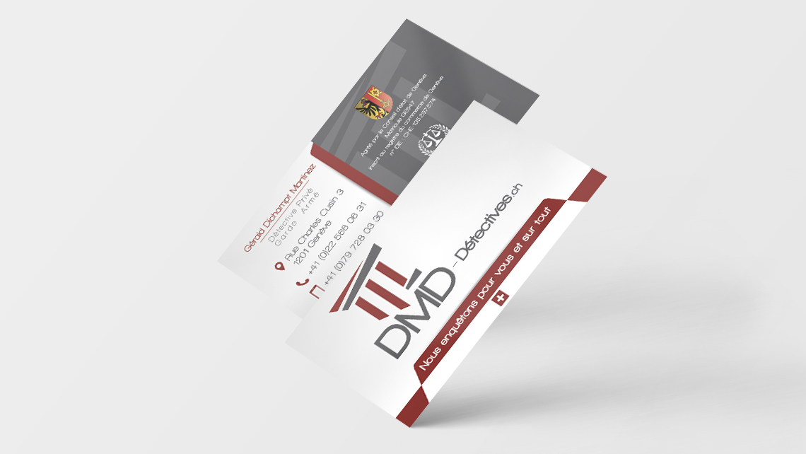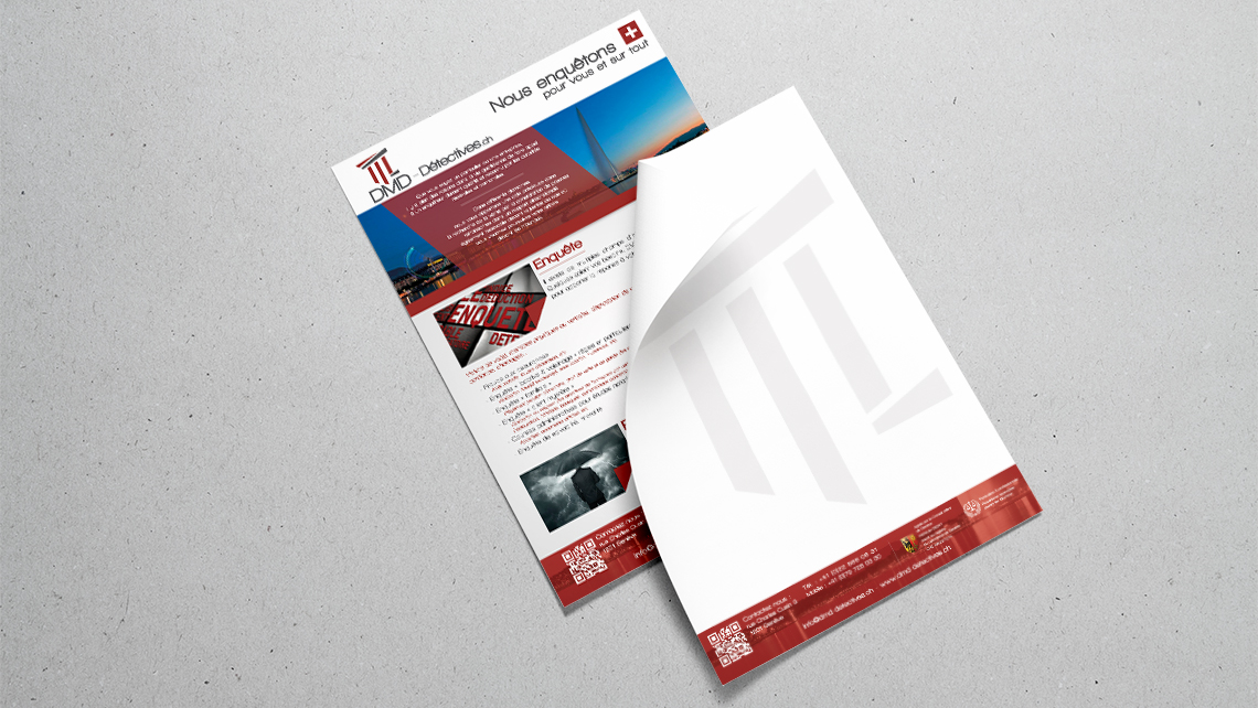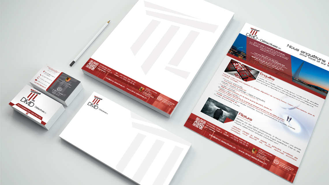 Conception et réalisation de tous les supports imprimés pour l'entreprise DMD Détectives : Cartes de visite, papiers en-tête, Brochures...