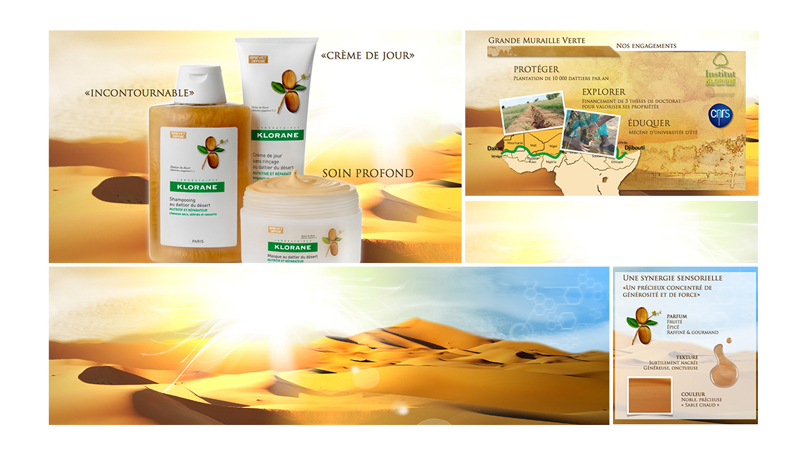Conception et réalisation de présentations intéractives, motion design, habillage vidéo, print, Logotypes et pictogrammes divers pour les shampooings et gammes de la marque Klorane.