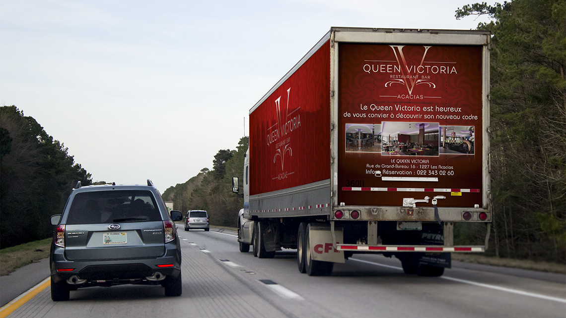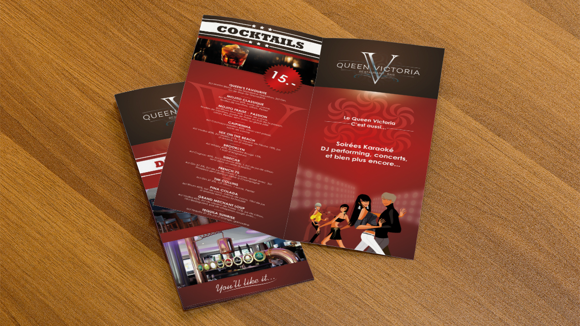 Création de toute une gamme d'imprimé pour le Queen Victoria, bar-restaurant basé à Genève aux Acacias. Cartes de visite, cartes de consommation et Covering camion entre autres.