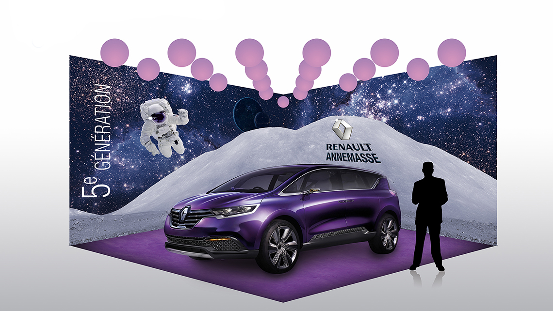 Conception de stands avec visuels géants et décors pour Renault Annemasse. Déclinaisons de ces projets sur d'autres concessions Renault dans la région haute-Savoie.