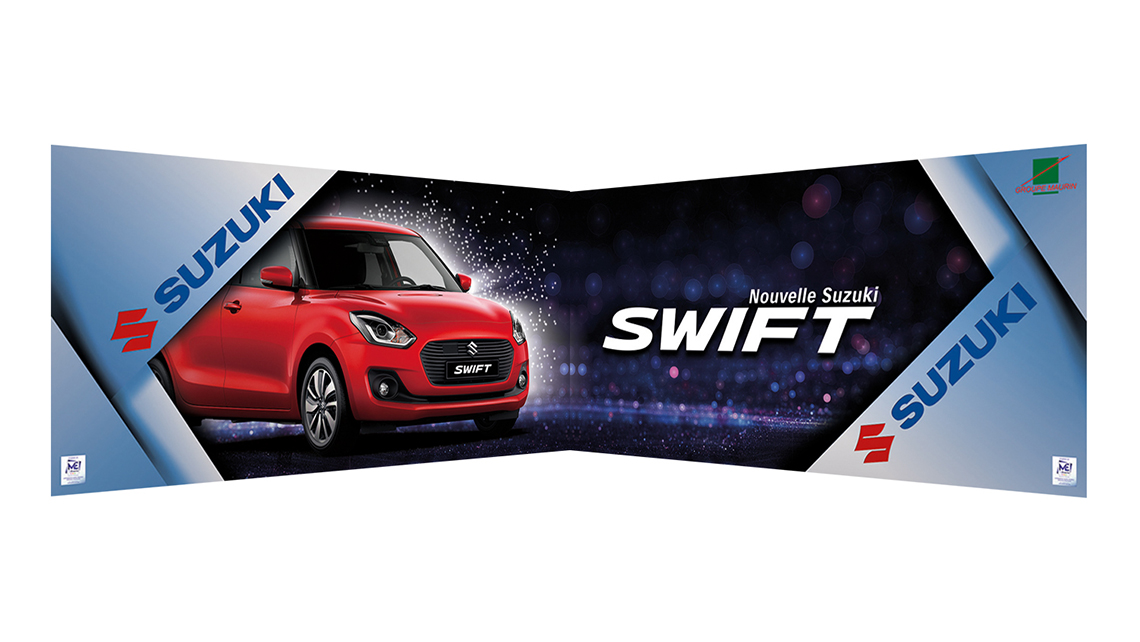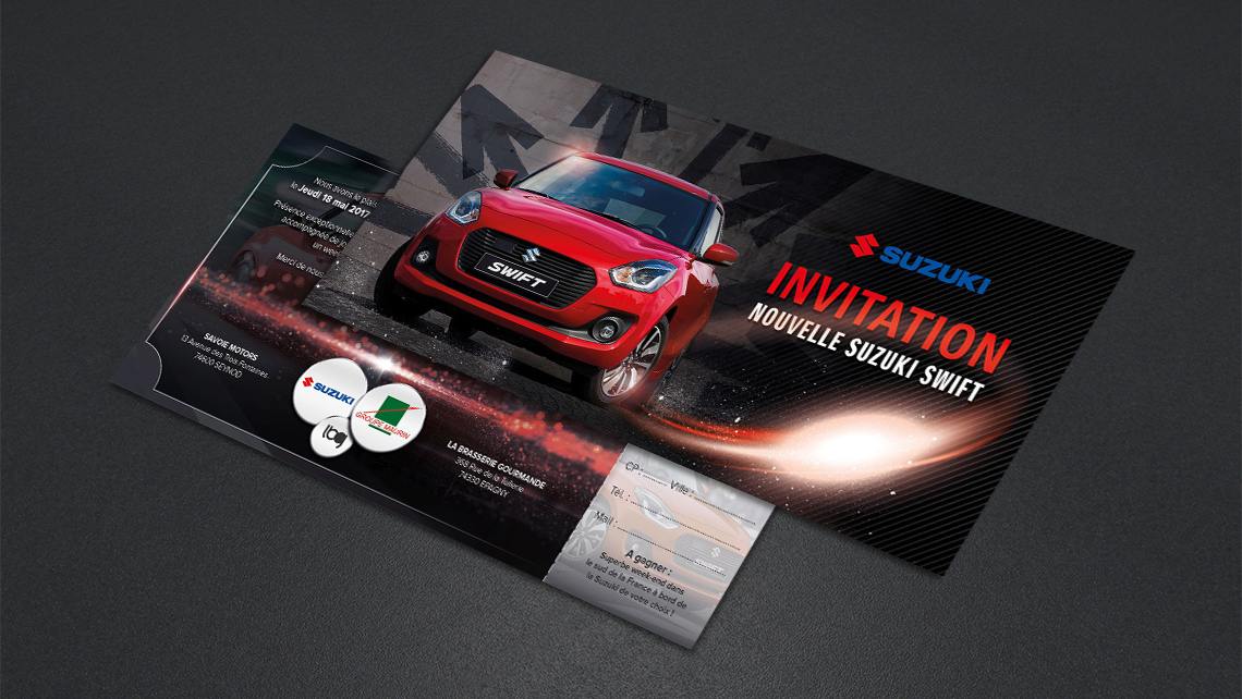 Réalisation de différents supports print (invitations, bâches grands formats) ainsi que d'une vidéo reveal pour la sortie de la nouvelle Suzuki Swift.